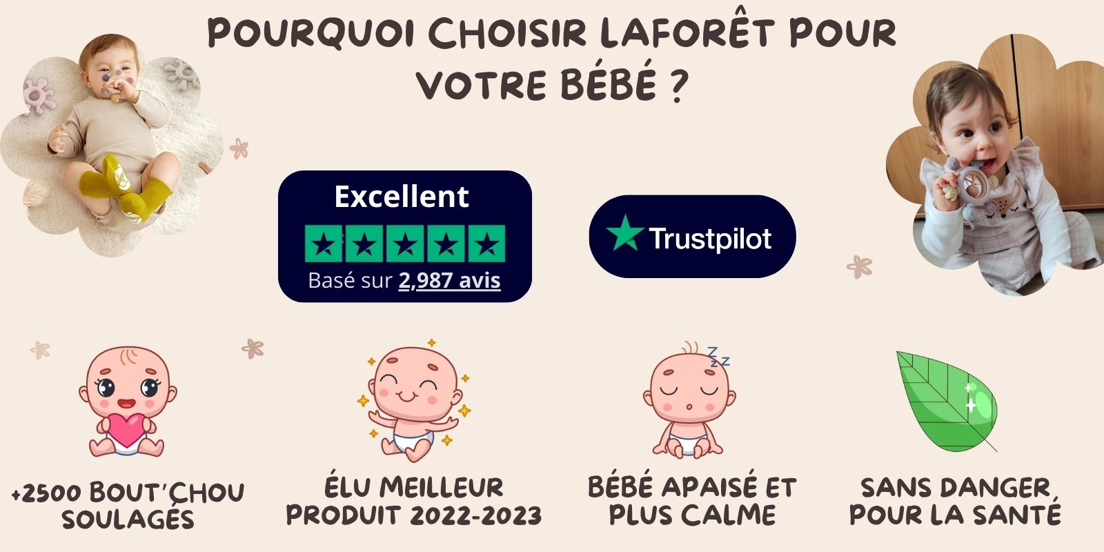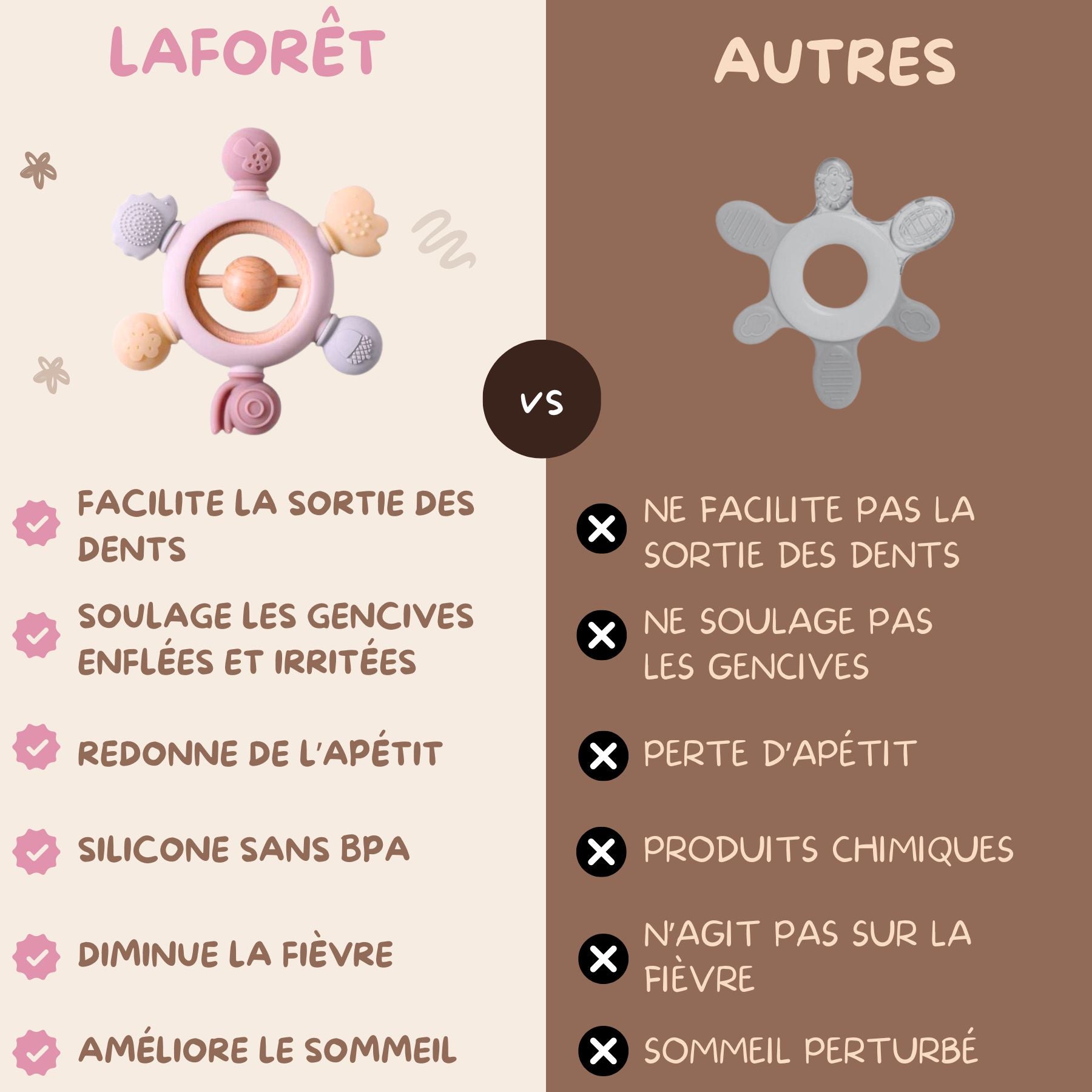 La douleur est l'un des facteurs principaux qui empêche votre enfant de bien dormir. Avec l'anneau de dentition LaForêt, votre bébé sera soulagé de la douleur et pourra reprendre des nuits paisibles.