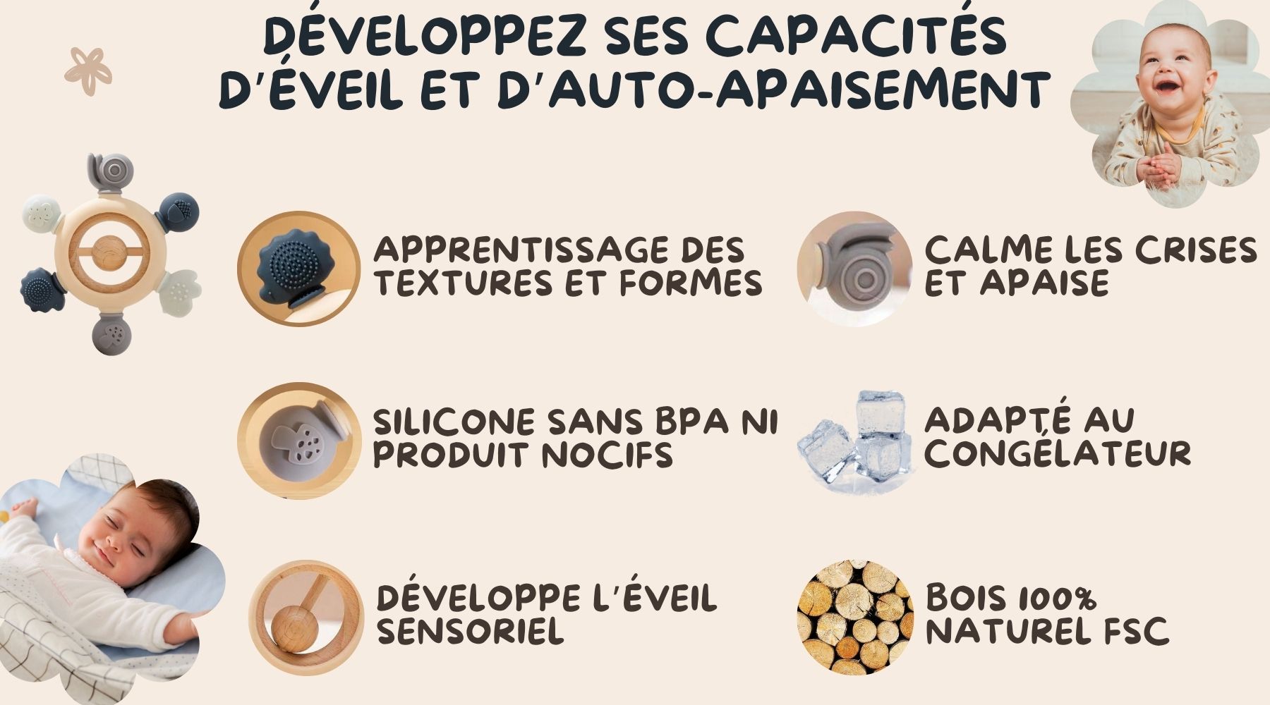Offrez un objet sûr et stimulant à mâchouiller à votre bébé. Aucun produit chimique ou nocif chez LaForêt.