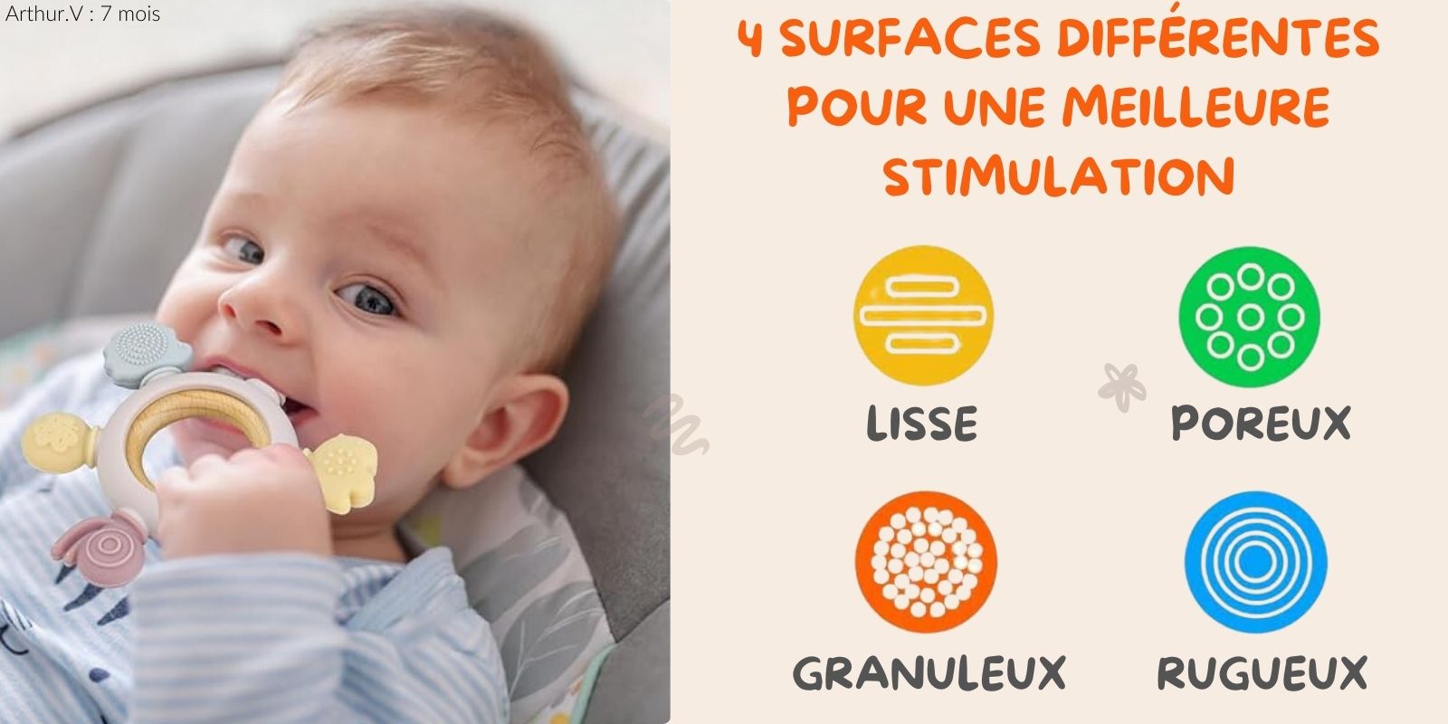 C'est l'une des fonctionnalités phare de notre anneau de dentition ! Non seulement il facilite la sortie des dents de votre enfant, mais il l'apaise et l'aide à se calmer tout seul à l'aide des différentes formes et textures. Terminer bébé ronchon.