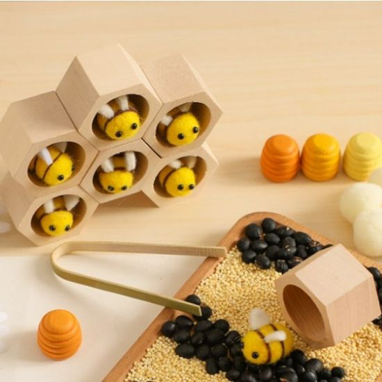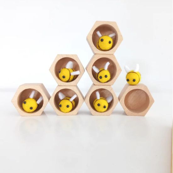 Cette merveilleuse ruche en bois est accompagnée de 7 blocs hexagonaux naturels, 7 adorables petites abeilles et d'un ensemble de pinces.