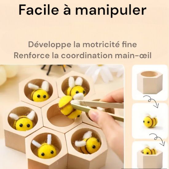 La particularité de ce jeu réside dans la petite pince fournie, qui permet à votre enfant d'attraper délicatement les petites abeilles dans la ruche.