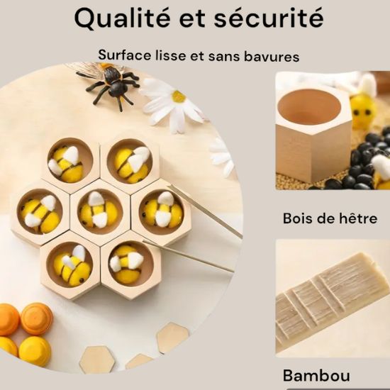 La particularité de ce jeu réside dans la petite pince fournie, qui permet d'attraper délicatement les petites abeilles dans la ruche offrant ainsi une dimension éducative enrichissante.